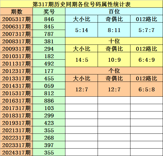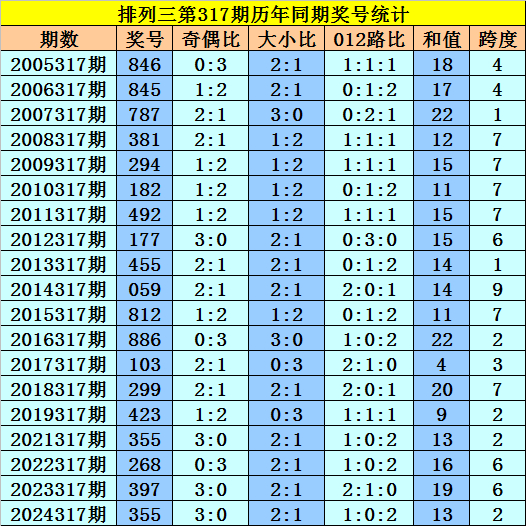 本期为排列三第2025317期开奖,历史上排列三第317期已开出了19期奖号了: